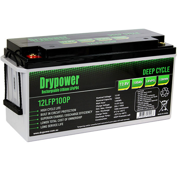 | Description | Drypower 12.8V 100Ah Lithium Iron Phosphate (LiFePO4) Rechargeable Lithium Battery - Up to 4 in Series Capable |