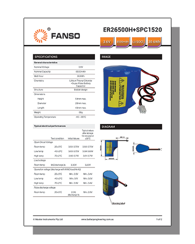 | Description | Fanso ES Storage Pack featuring ER26500H 3.6V 8.5Ah Lithium Thionyl Cloride Cell with SPC1520 Super Pulse Capacitor |